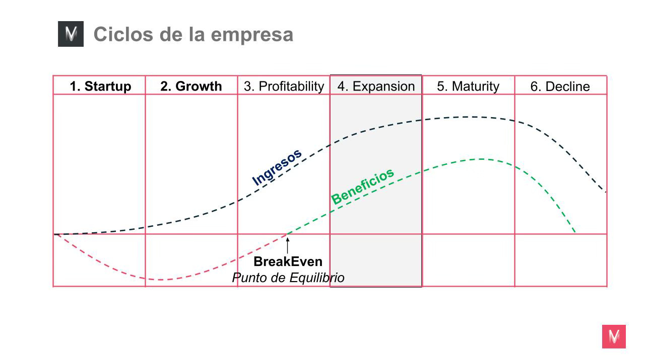 ¿Qué toca ahora? Después de conseguir beneficios, ahora la empresa necesita expandirse a más países o a mercados adyacentes con nuevas unidades de negocio. Se convierte en una multinacional. Esta es la fase de expansión