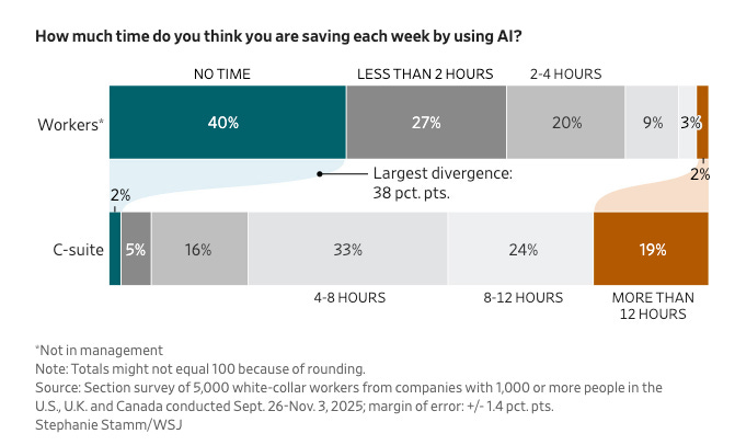⏱️🧠 IA: el ahorro de tiempo no está repartido. Ahorra +8 horas/semana para +40% de ejecutivos, mientras 2/3 del staff no directivo dice que ahorra <2 horas. ¿Cuanto hay de postureo o de realidad? ¿la coordinación y la síntesis ahorra mucho más?