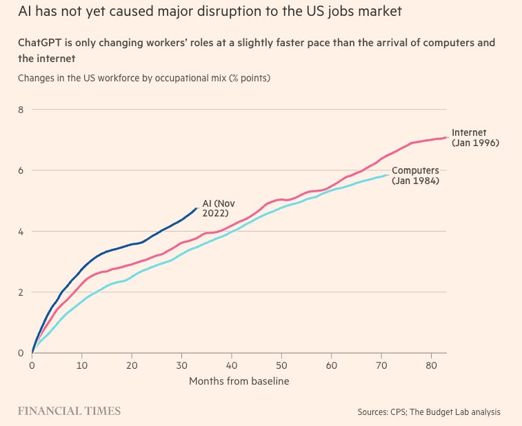 🤖🇺🇸 Un Estudio en EE.UU. concluye que la IA no está destruyendo empleos: no hay evidencia clara de que herramientas como chatbots estén desplazando a los trabajadores. 👉 i ) yo añadiría por ahora y ii) Hay dos maneras de destruir empleo: la primera, despedir, la segunda, que nuevas empresas con muchos menos empleados hagan quebrar las actuales.