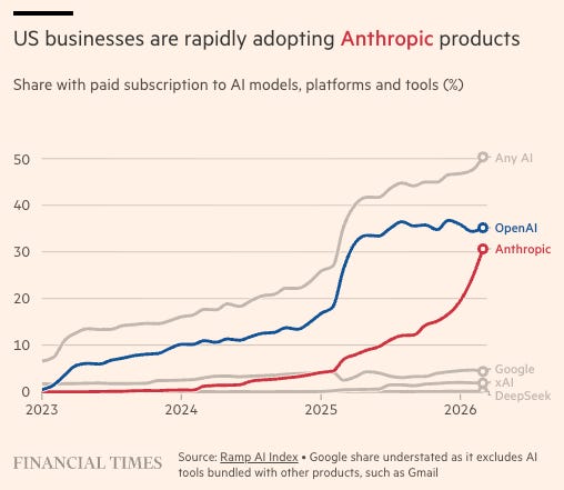 🤖 Anthropic gana terreno en empresas, te actualizo los datos de ayer: el 30,6% de los negocios de EE.UU. pagó por sus herramientas en marzo, frente al 24,4% de febrero. OpenAI se mantiene plano en torno al 35%.
