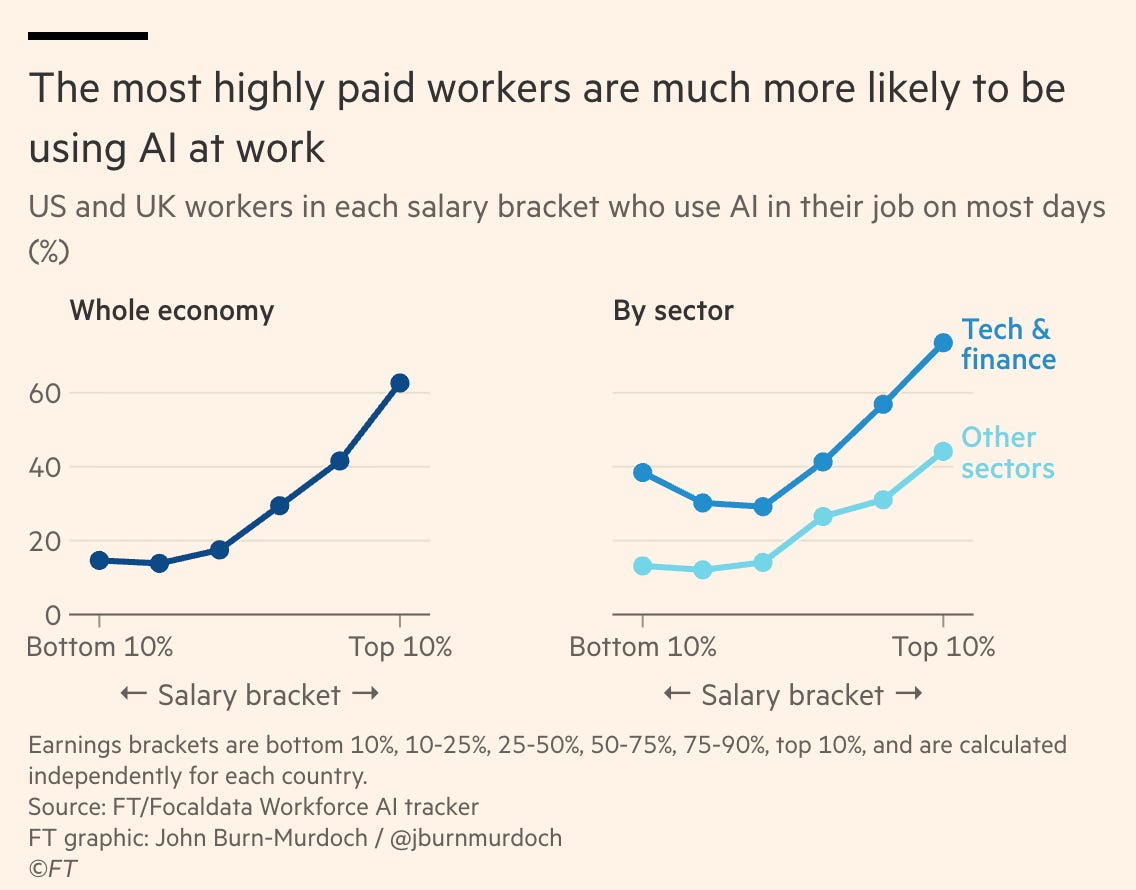 🤖 IA y brecha laboral. Una encuesta a 4.000 trabajadores en EEUU y Reino Unido revela que son los empleados con mayor experiencia y salarios más altos quienes adoptan la IA más rápido.