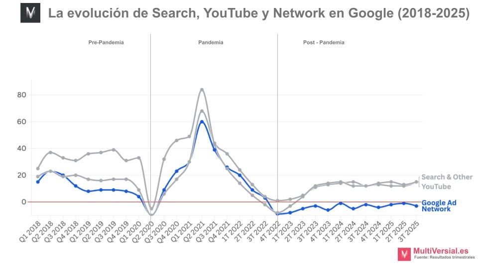 💼 El viejo motor paga la fiesta: Search y YouTube. Aquí está la parte que casi nadie quiere mirar porque parece aburrida. Search + YouTube = la máquina de imprimir dinero más rentable jamás creada.