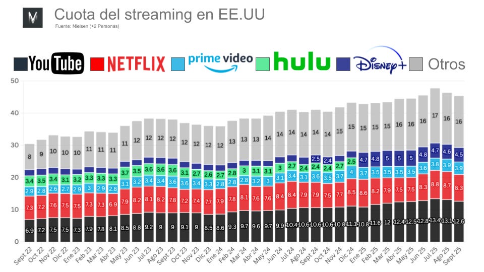 📉 ¿Qué competidores? No están solos en la meseta. El bundle de Disney (Disney+, Hulu, ESPN+) y Amazon Prime Video también se han estabilizado, con cuotas en torno al 5% y 4% respectivamente.