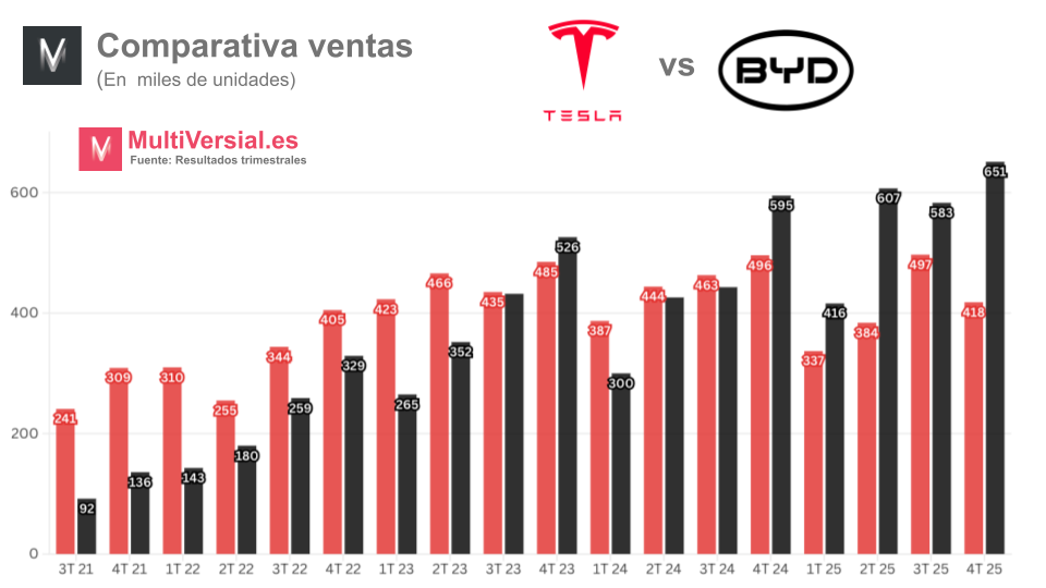 🚗 Competencia y entregas en picado. Tesla reportó una caída del 16% en entregas durante el 4T y 8.6% para el año completo. BYD y otros fabricantes chinos continúan ganando cuota de mercado de manera agresiva.